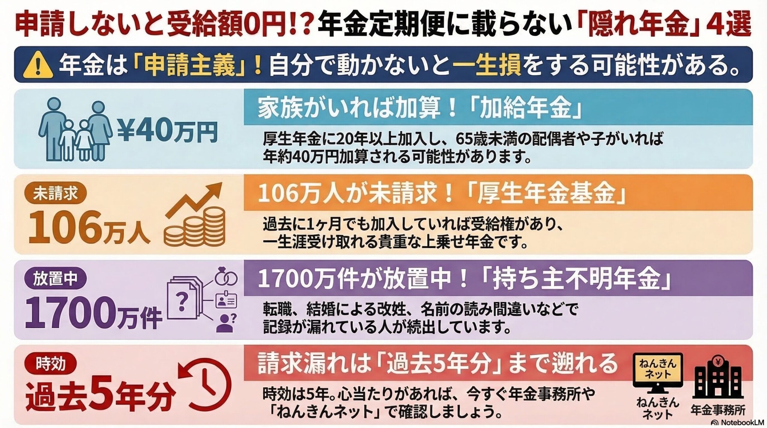 【具体例:もらい忘れに要注意!4つの年金詳細】